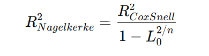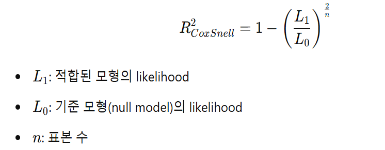 일반 선형 회귀의 R²와 유사한 지표로, Cox & Snell R² 또는 Nagelkerke R²가 자주 사용된다. Cox & Snell R² 는 아래 식에서 보듯이 선형회귀의 R²와 유사한 방식으로 정의되지만 최대값이 1보다 작다. 그리고 최대값이 1이 되도록 수정한 것이 Nagelkerke R²다. 그런데 이들은 모델 적합도가 얼마나 개선되었는가를 나타내는 것이지, R²처럼 변량을 설명한 정도를 나타내는 것이 아니다. 따라서 해석시에는 설명력이 높다 또는 낮다와 같이 절대적으로 해석하기 보다는 모형 간 상대적 비교로 해석한다. 예컨대 Nagelkerke R² = 0.114로 기준모형에 비해 일정 수준의 설명력을 가진다 정도로 해석할 수 있다. 여기서 기준모형이란 독립변수를 하나도 넣지 않고 종속변수만 예측하는 경우를 말하고 완전모형은 독립변수를 모두 넣은 모형을 말한다.