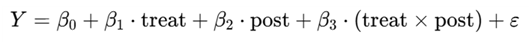 DID는 결국 일반 선형회귀분석을 실시하되, 혼란변수 대신에 위 식에서 보듯이 시간과 처치여부 그리고 상호작용 항을 사용한 것이다.