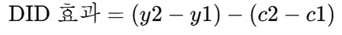시점 t1에서 t2의 변화기간 동안 처치집단은 Y2-Y1의 변화가 있었고, 통제집단은 c2-c1의 변화가 있었다. 그런데 정책효과가 없다면 이 두 변화량은 과거에 그랬듯이 비슷할 것이다. 반면에 정책에 효과가 있다면 처치집단의 변화와 통제집단의 변화가 다를 것이라고 보는 것이다. 즉